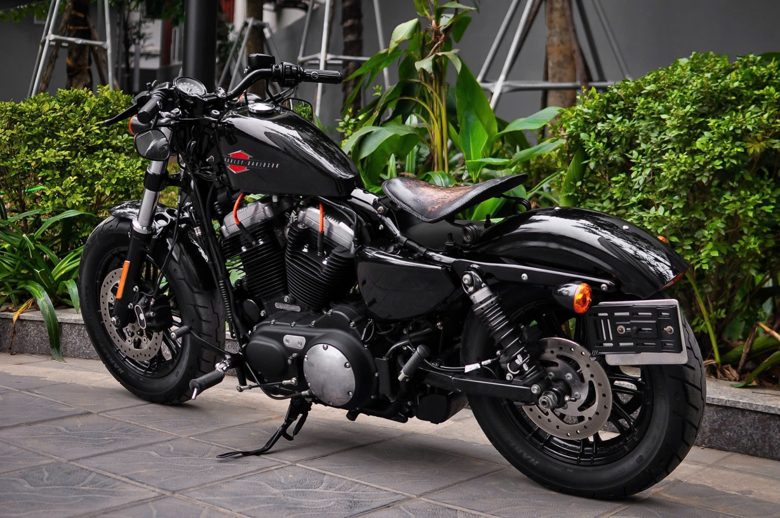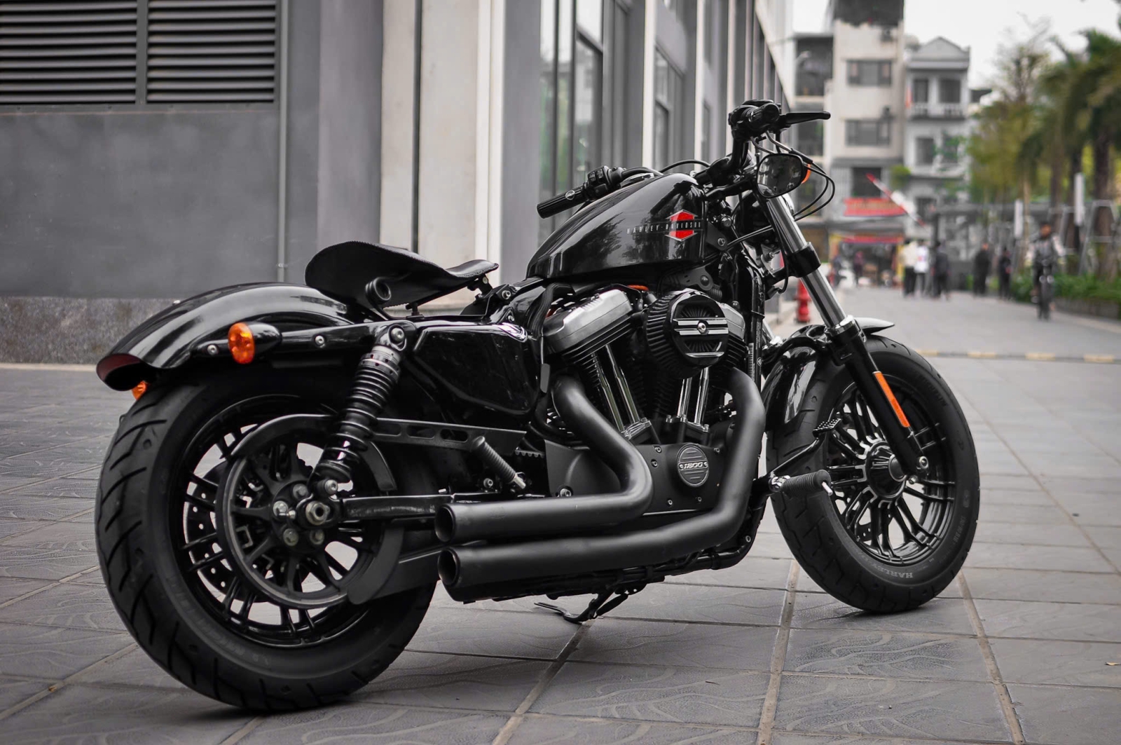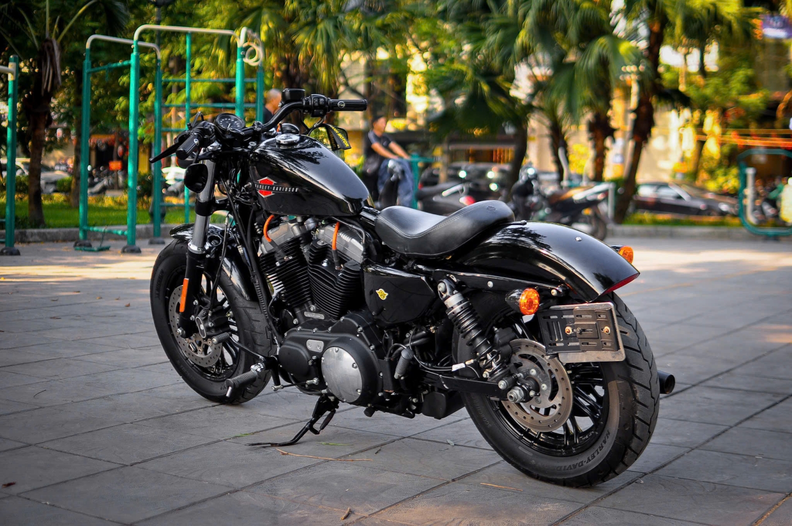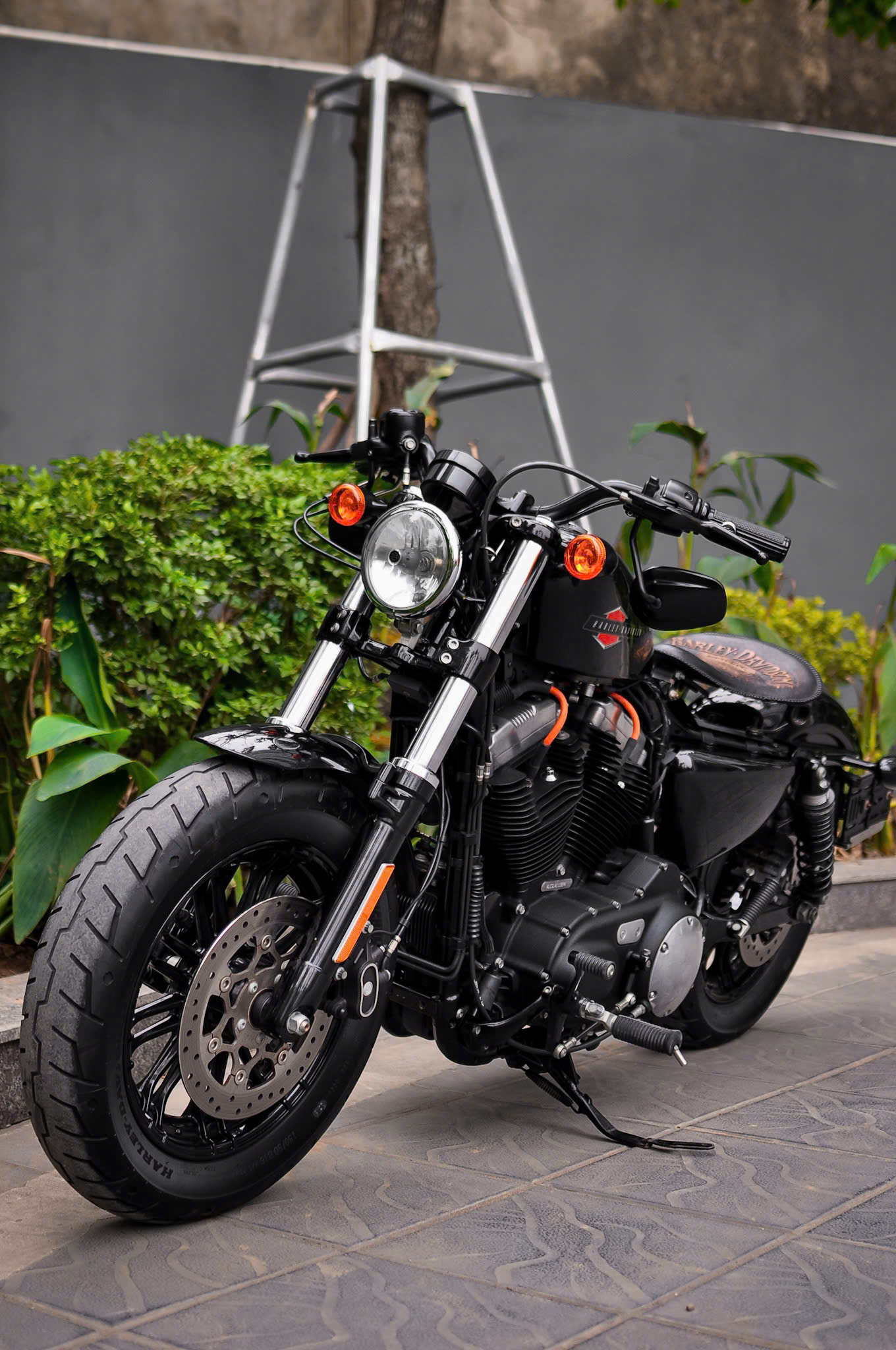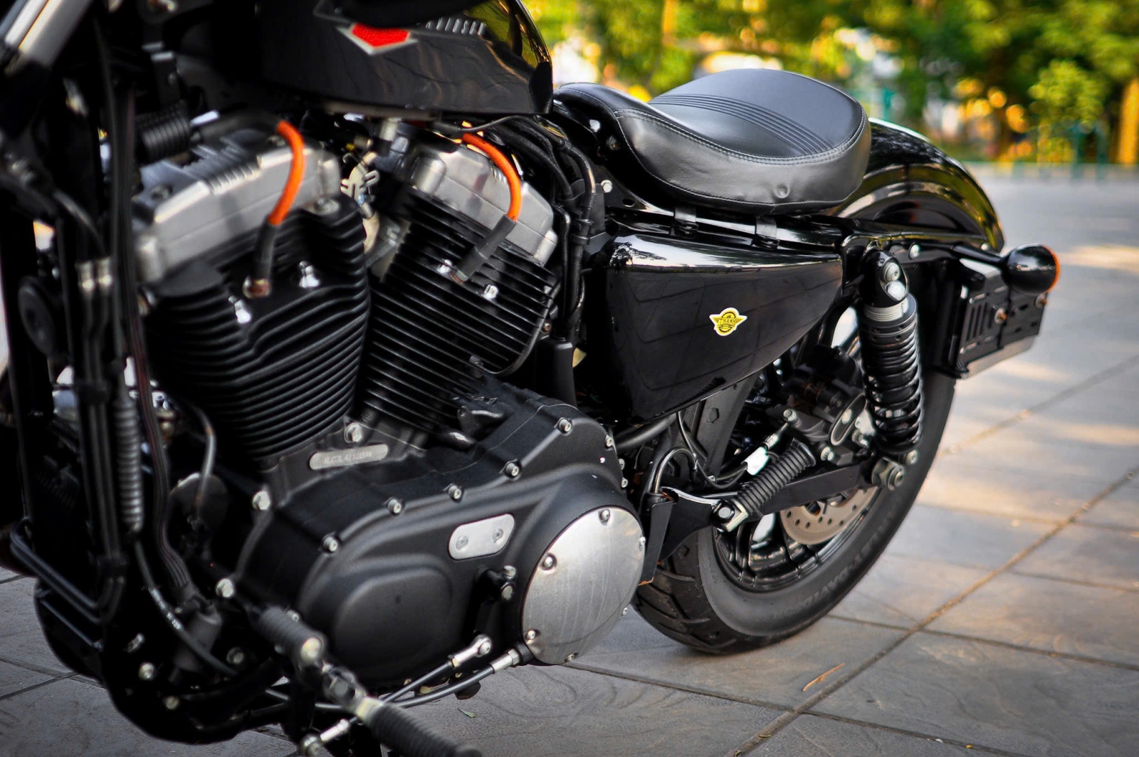 Chiếc Harley Davidson Forty Eight nổi bật với thiết kế bình xăng hình lê trứ danh cùng logo Harley-Davidson đặc trưng. Yên xe thấp giúp người lái dễ dàng kiểm soát xe trong mọi tình huống. Hệ thống treo trước với phuộc đơn giảm xóc nhún và hành trình ngắn, tạo cảm giác lái chắc chắn và linh hoạt.