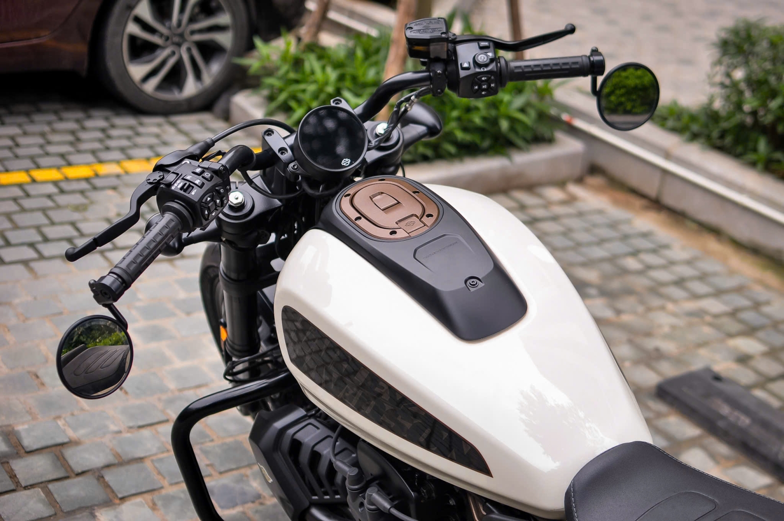Mẫu xe này được trang bị yên xe solo stylized, tạo dáng vẻ gọn gàng và thể thao, trong khi bình xăng hình giọt nước mang tính biểu tượng giúp nâng cao tính thẩm mỹ và thoải mái cho người lái. Đèn pha LED hiện đại không chỉ đem lại ánh sáng sắc nét mà còn góp phần vào diện mạo hầm hố cho chiếc xe.