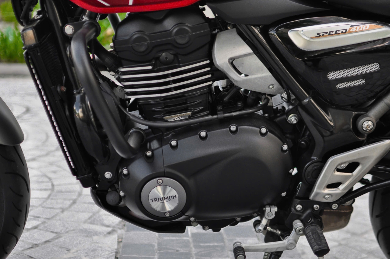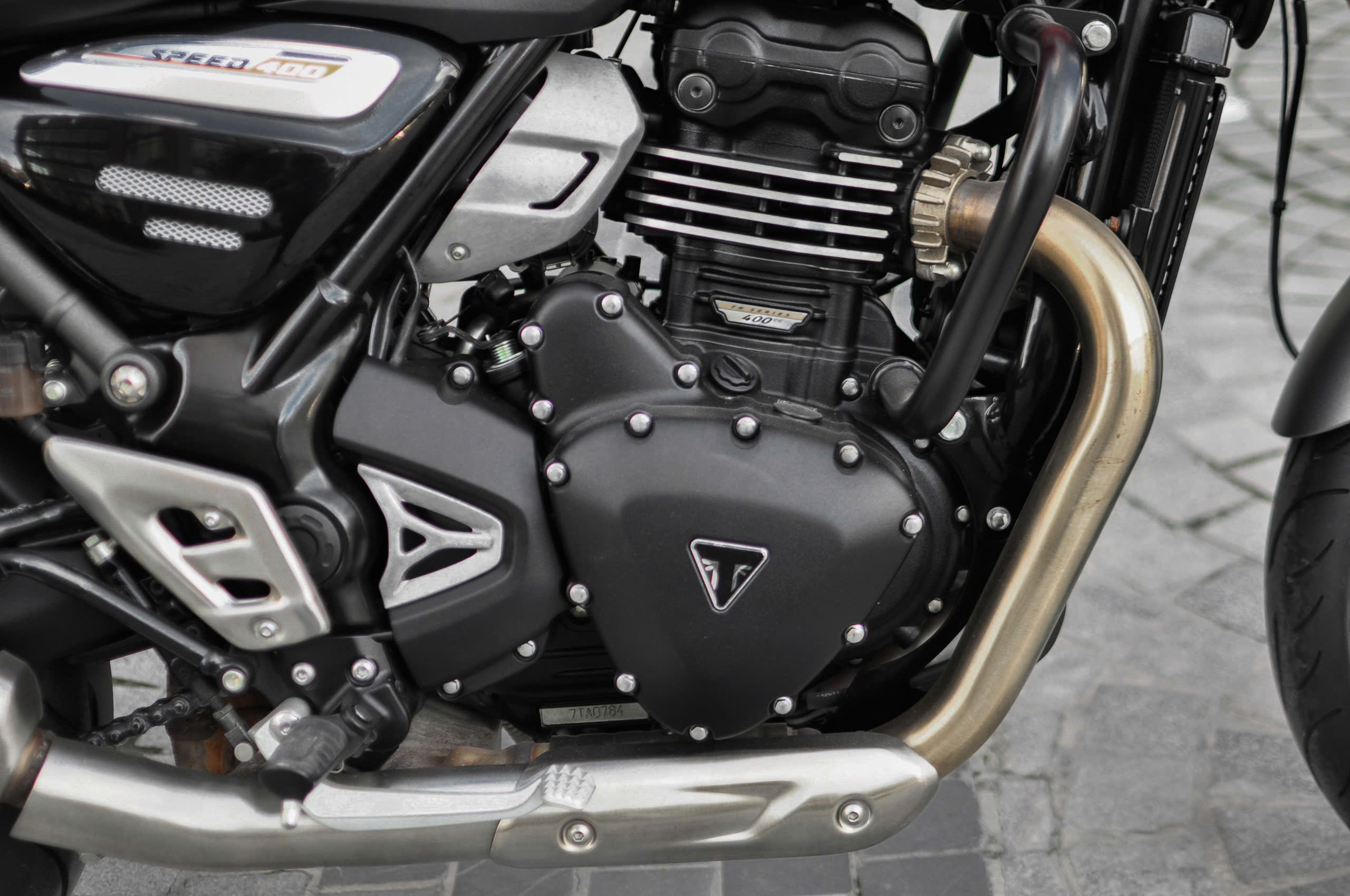 Với động cơ xy-lanh đôi dung tích 400cc, Triumph Speed 400 mới mang lại sức mạnh mượt mà nhưng vô cùng mãnh liệt. Động cơ này không chỉ được tối ưu hóa để cung cấp hiệu suất cao nhất với khả năng tăng tốc nhanh chóng, mà còn khắc phục được những nhược điểm về tiếng ồn và rung động từ các phiên bản trước. Hơn nữa, chiếc xe này cũng được trang bị hệ thống phun xăng điện tử tiên tiến giúp tiết kiệm nhiên liệu tối đa.